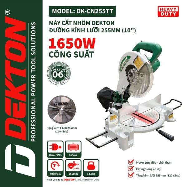 Máy cắt DEKTON DK- CN 255 TT là dòng máy cắt có công suất 1800W, có thể dùng để cắt nhôm, gỗ với đường kính lưỡi cắt là 255 mm, có chế độ cắt nghiêng 45 độ, tặng kèm lưỡi cắt 120T